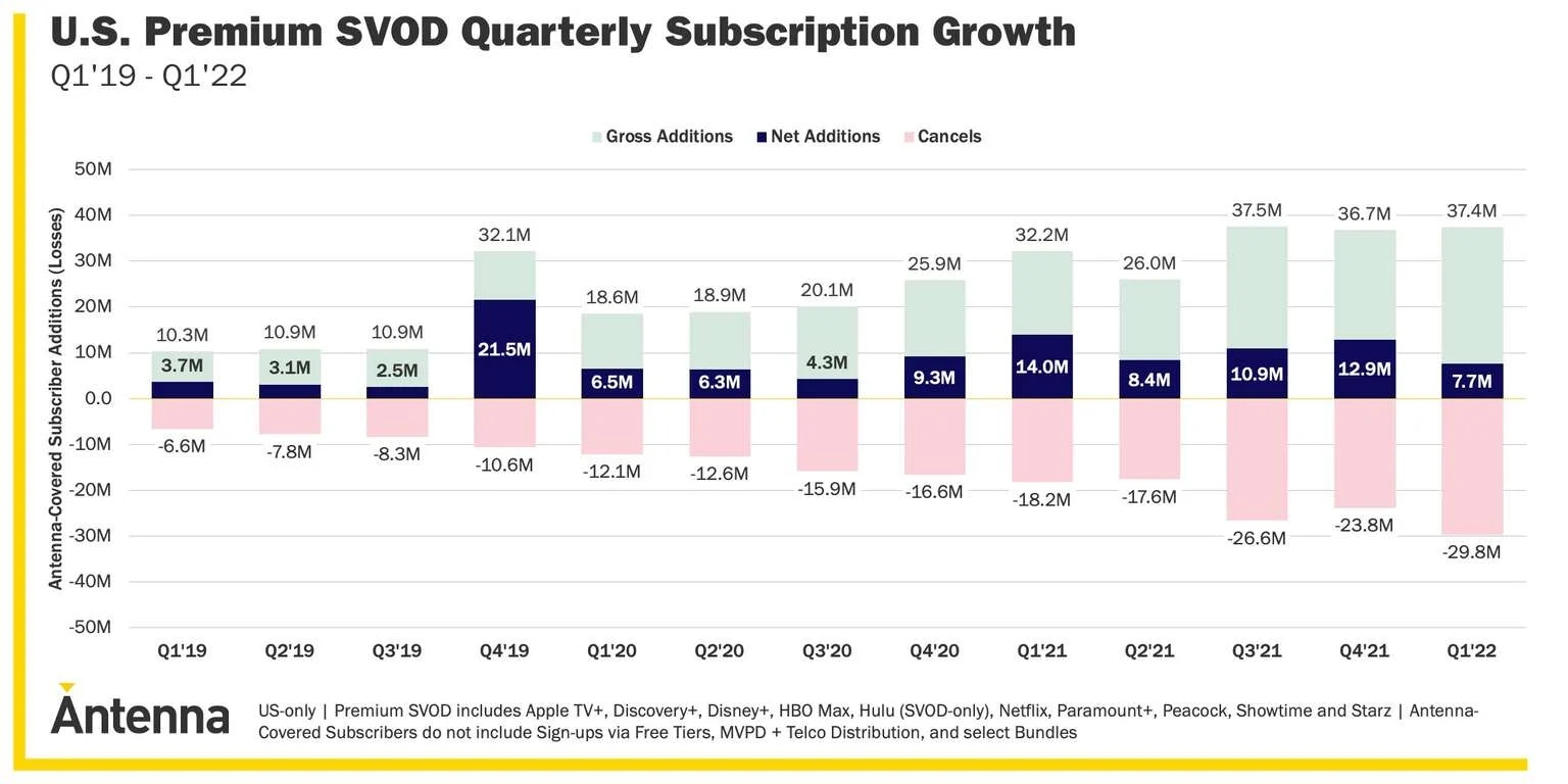 While subscriber growth may be high right now, so are cancellations. There were just under 30 million cancellations in Q1 2022, which is 12% higher than any quarter in history, or 4.5 times the cancel volume seen three years prior, Antenna finds.