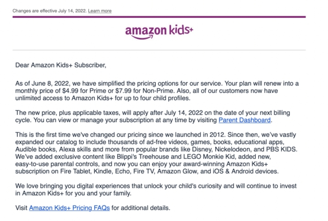Subscribers to Amazon’s Kids+ multiplatform package have been notified about a price change, which will become effective on July 14. According to the email sent by Amazon, the company is simplifying the pricing structure and will be converting all Prime members to a $4.99 monthly tier and all non-Prime subscribers to the $7.99 option. In addition, all users will get unlimited access to the service for up to four child profiles.