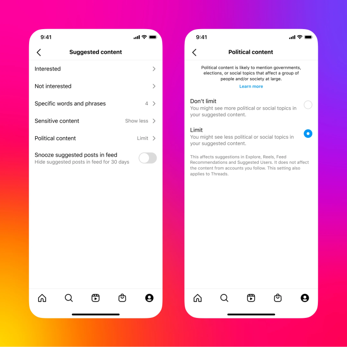To be clear, Meta’s coming changes impact Instagram’s role in recommending content, but not how it shows content from accounts users already follow, the company said. For example, if an account that’s not eligible for recommendation posts political content, like news about elections, laws or other social topics, that account’s content will still reach its followers via the Feed and Stories. It just won’t be proactively recommended to non-followers.