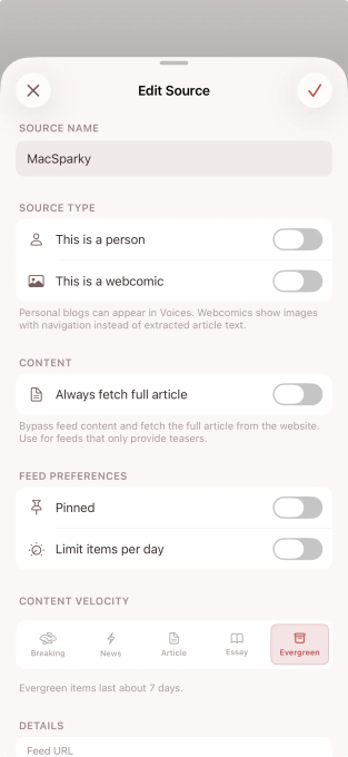 The app adds some intelligence to your reading experience, too: If a site is flooding your feed, the app will prompt you to quiet or rate-limit them. It also notices when you regularly skip specific content or enthusiastically read it, and will suggest you either remove feeds you don’t read often or pin those that you do.